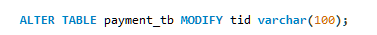 SQL 1일 1쿼리 by 남행비 2023. 10. 16. payment_tb에 tid를 varChar(100)타입으로 변경하기 변경하는 쿼리 결과화면 타입 보는 쿼리 변경된 모습 공유하기 게시글 관리 남형빈의 개발 블로그 'SQL' 카테고리의 다른 글 1일 1쿼리 (0) 2023.10.20 1일 1쿼리 (0) 2023.10.18 1일 1쿼리 (0) 2023.10.13 1일 1쿼리 (0) 2023.10.12 1일 1쿼리 (0) 2023.10.11 관련글 1일 1쿼리 1일 1쿼리 1일 1쿼리 1일 1쿼리