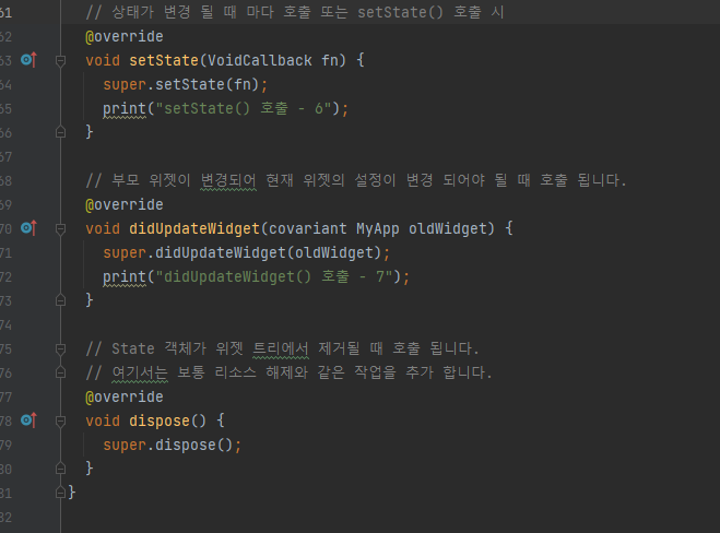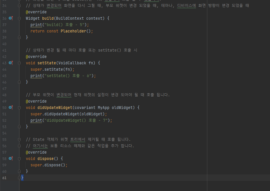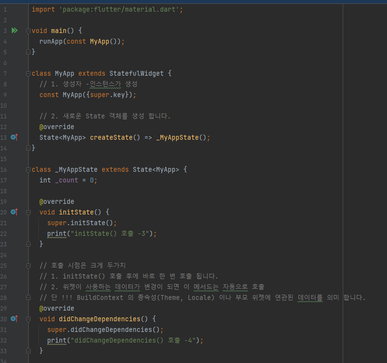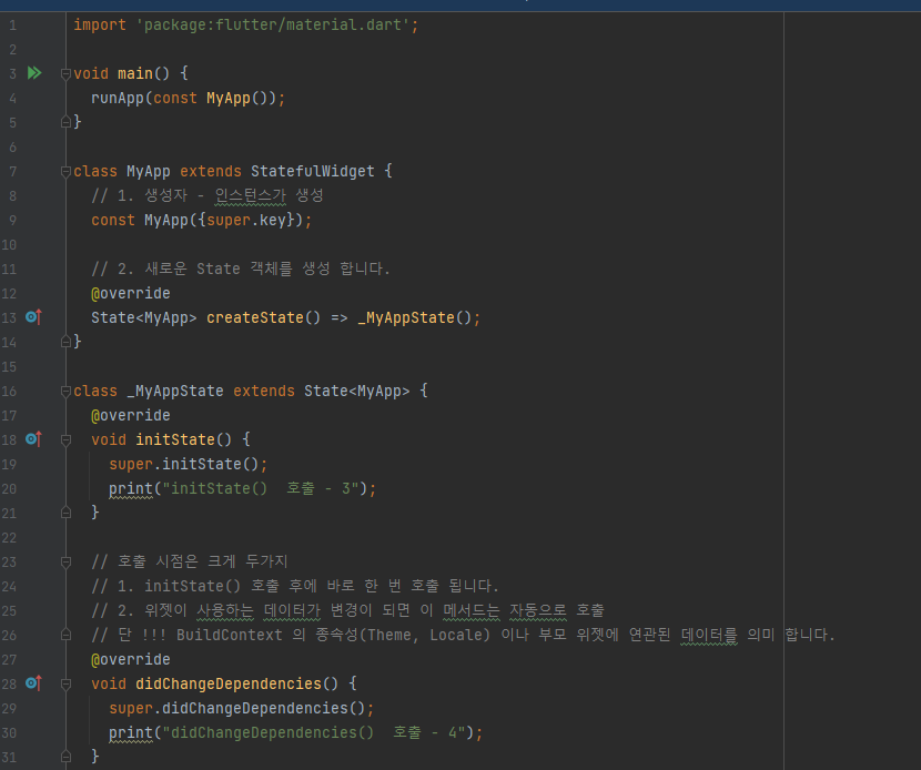 StatefulWidget은 상태를 가지는 위젯입니다. 그래서 생명주기가 복잡합니다.