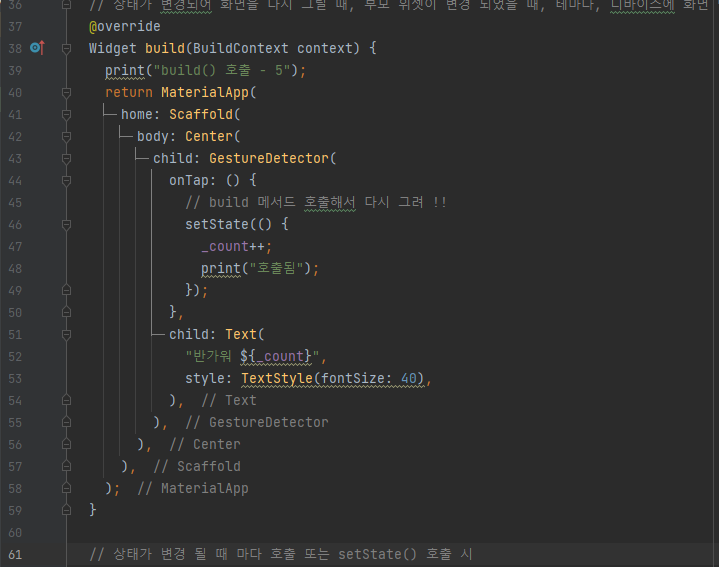 - build - 위젯이 빌드되어 화면에 UI를 표현합니다.