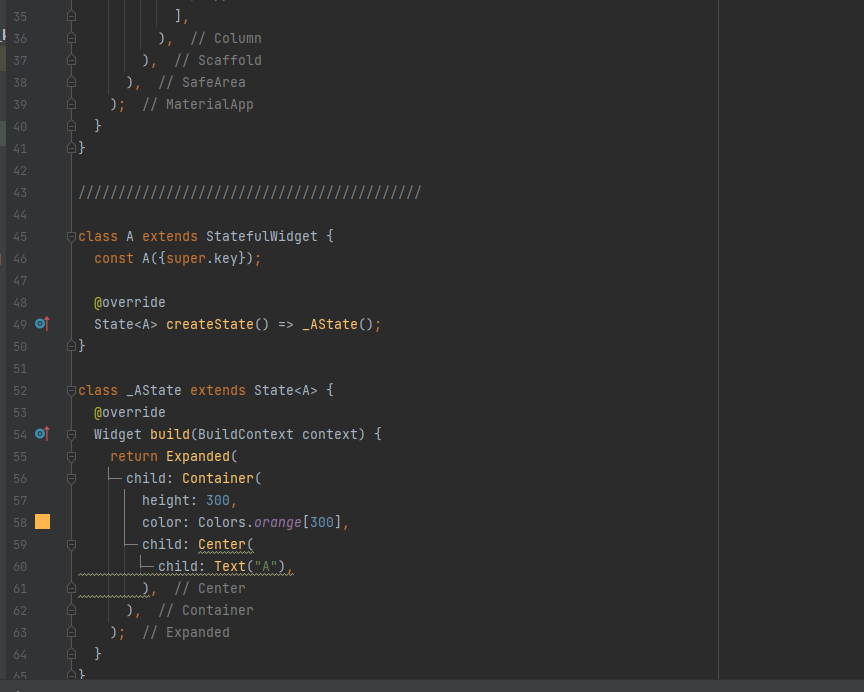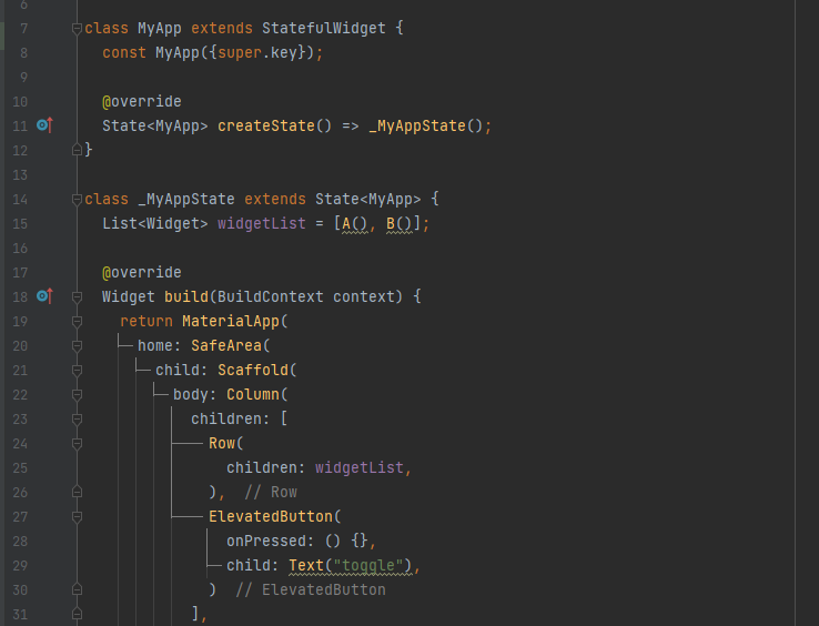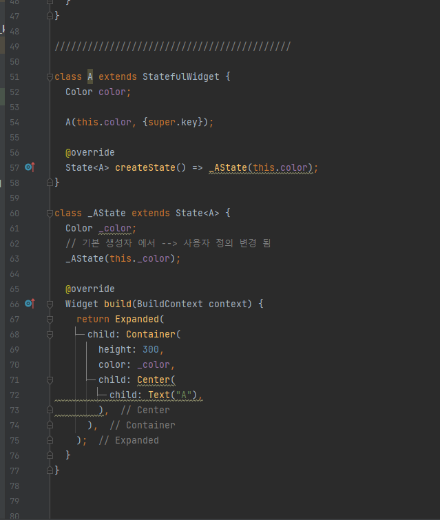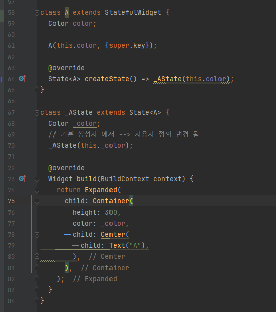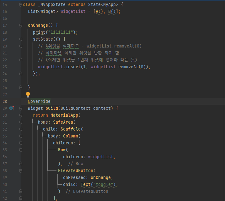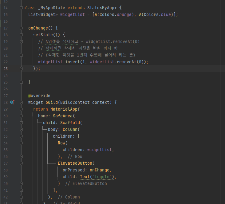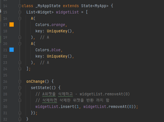 | change() 메서드를 실행하면 사실 위젯은 변경이 되지만 색상은 변경 되지 않습니다. 즉, 위젯 트리 구조가 변경되면서 Stateful 하위 객체인 State 객체를 각 위젯 객체에 올바르게 연결해야 하지만 데이터 타입이 같아서 제대로 식별하지 못하는 경우 입니다. |