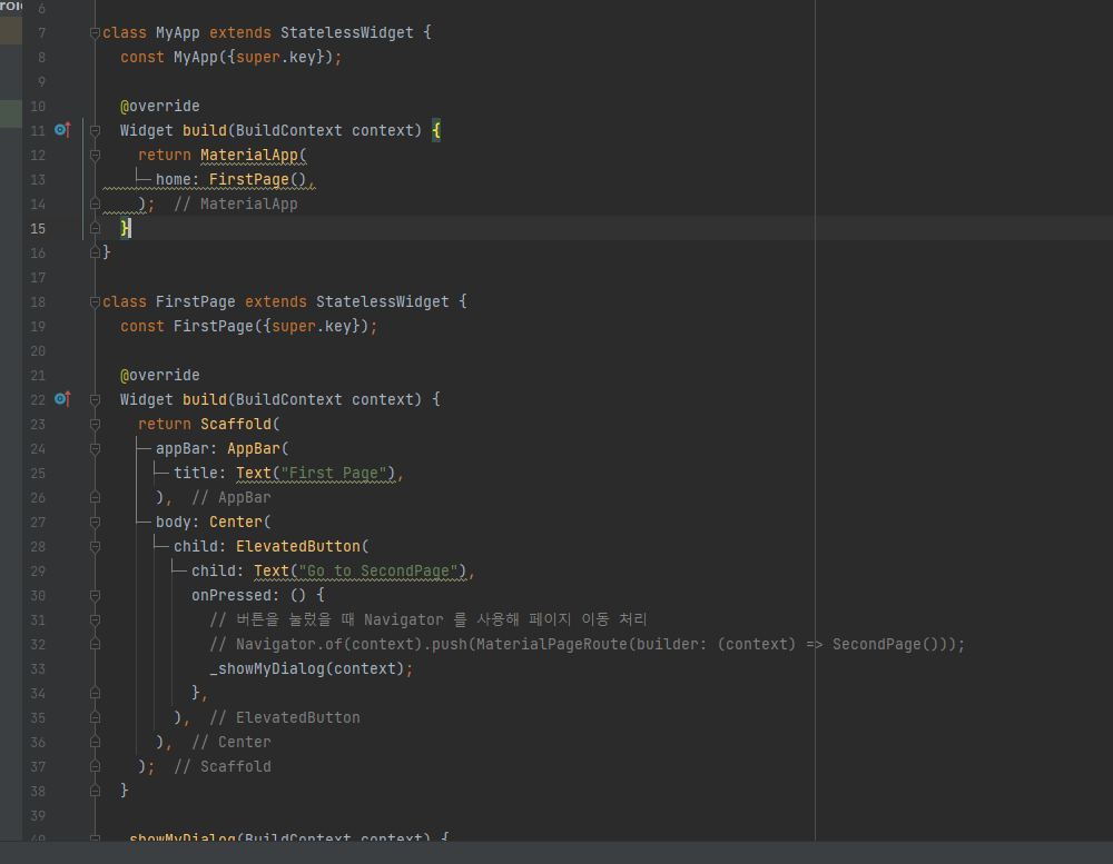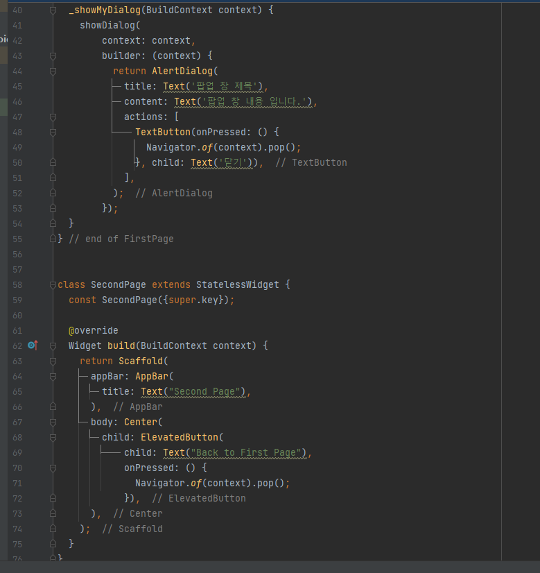- BuildContext: 위젯 트리 내에서 위젯의 위치에 대한 참조입니다. Navigator를 사용하려면 대부분의 경우 현재의 BuildContext가 필요합니다.