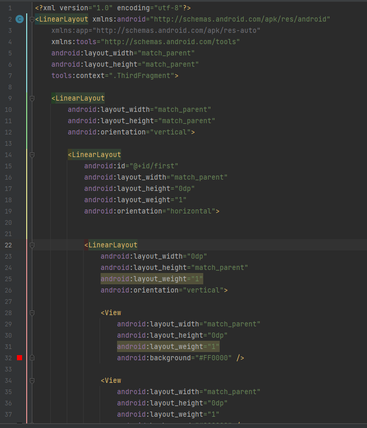 5) baselineAligned : 가로로 배치된 자식뷰들을 텍스트의 baseline을 기준으로 정렬합니다. (ex, baselineAligned="true")
