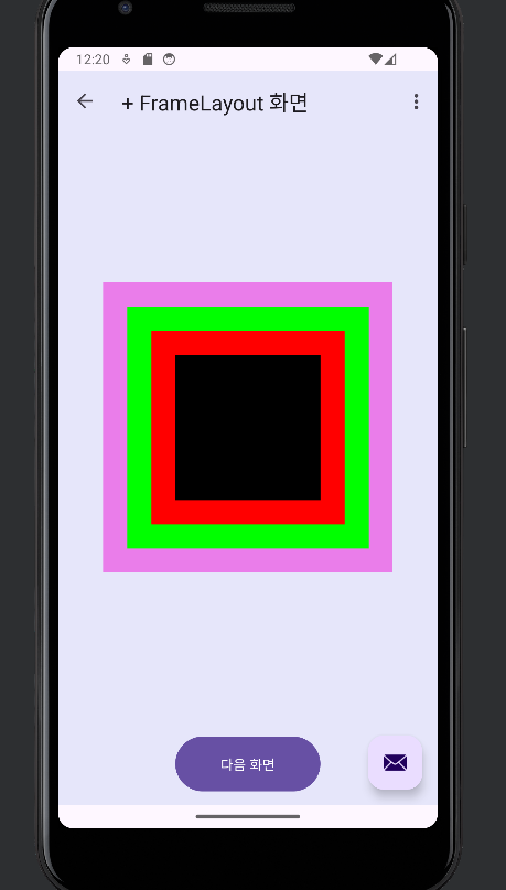 FrameLayout은 여러 개의 뷰를 중첩으로 배치하고 그중 하나를 레이아웃의 전면에 표시할 때 사용하는 레이아웃입니다.