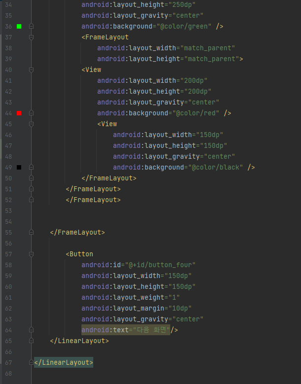 제일 위에 보여지는 뷰는 xml 코드에서 가장 마지막에 작성한 뷰가 배치된다.