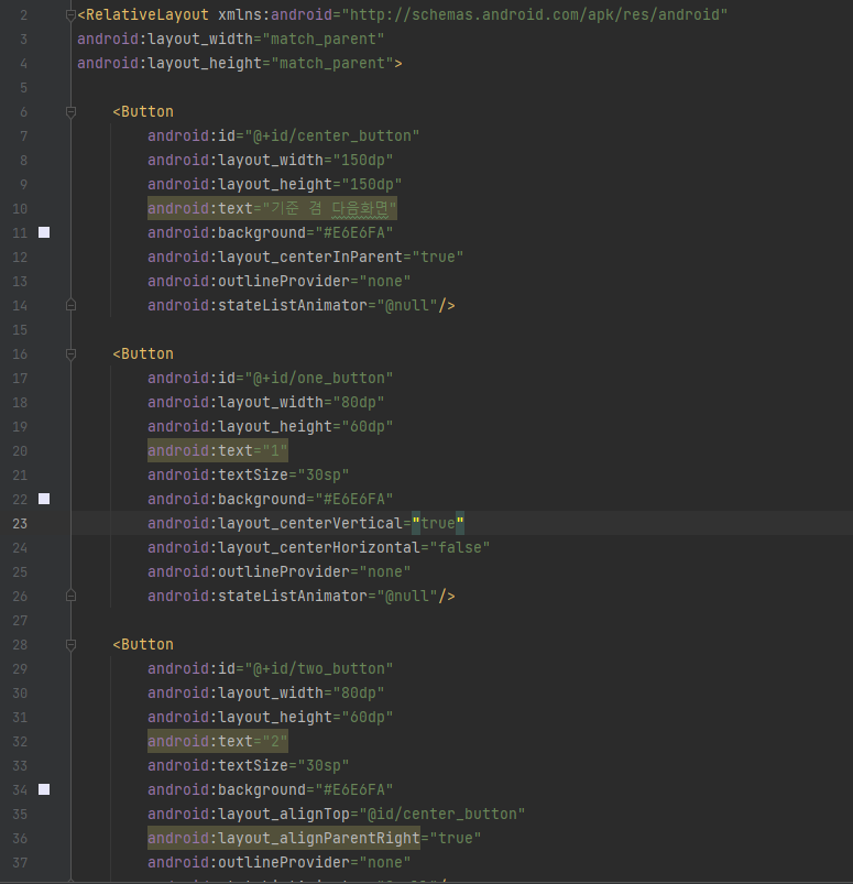 - layout_centerInParent : 부모 뷰그룹의 정중앙에 위치시킵니다.