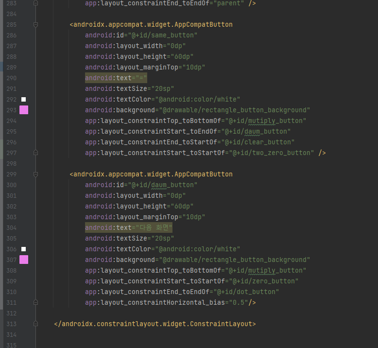 - layout_constraintEnd_toEndOf : 해당 뷰의 끝위치를 지정된 요소의 끝 위치와 맞춥니다.