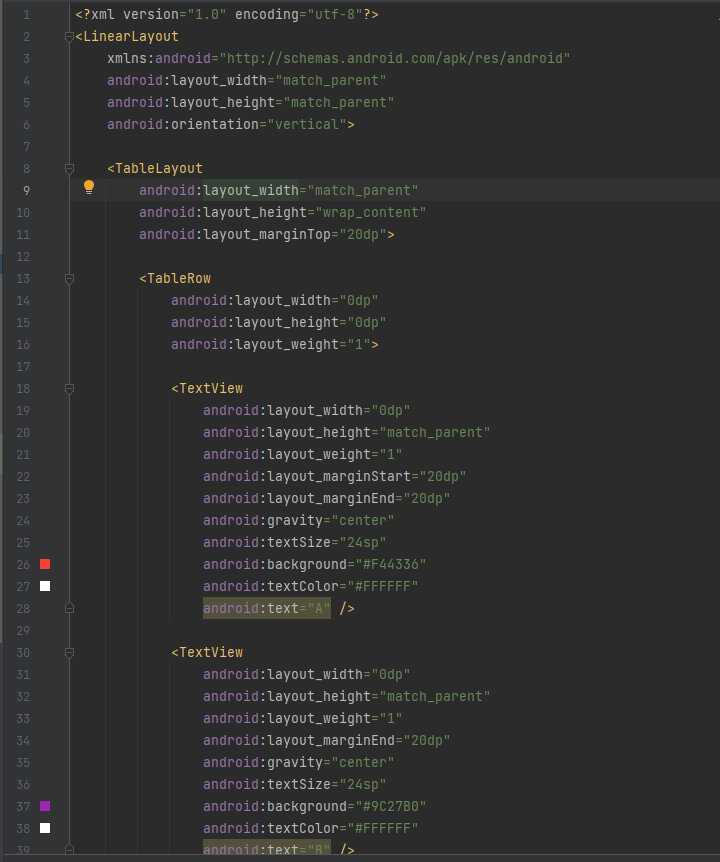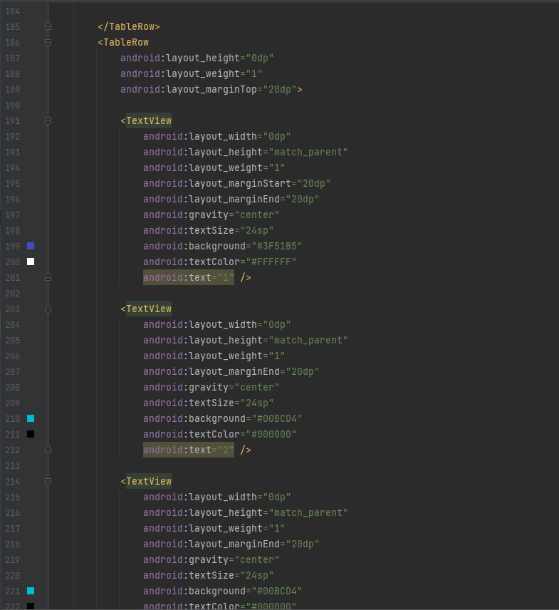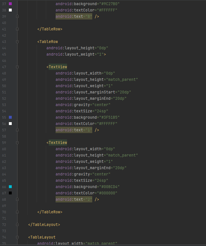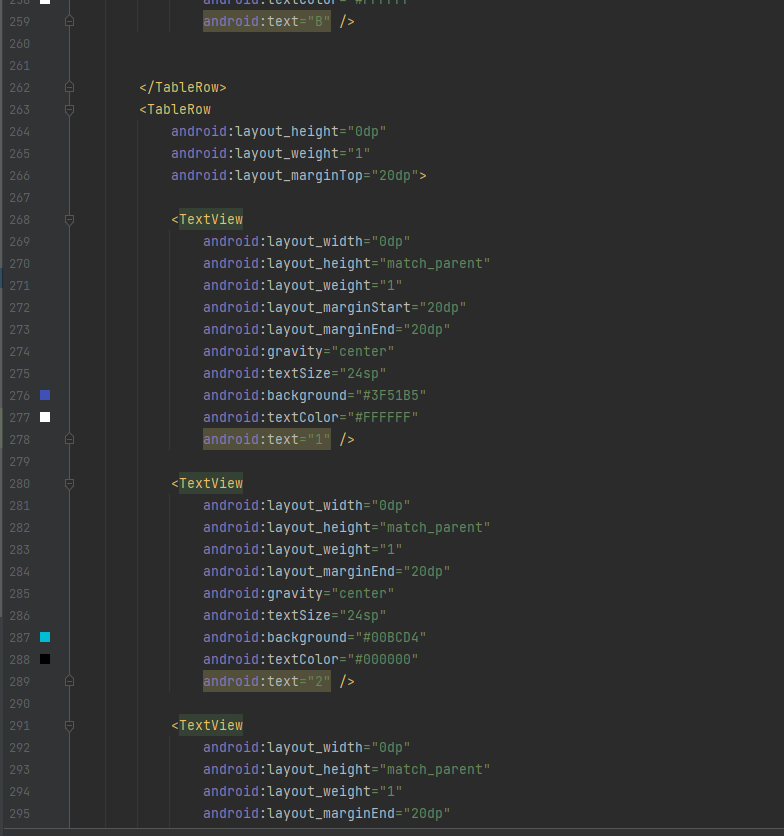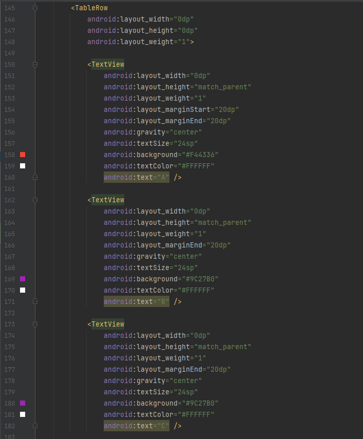 ( 하나의 행(Row)을 추가할 때는 "<TableRow>"라는 요소를 명시적으로 사용하지만, 열(Column)을 추가하는 요소는 별도로 정의되어 있지 않습니다. 대신, "<TableRow>"에 뷰(View) 위젯을 선언하는 것만으로 새로운 열(Column)이 추가됩니다. )