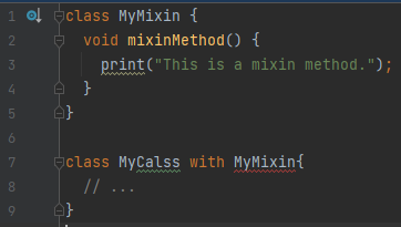 Mixin 정의: with 키워드를 사용하여 클래스가 믹스인을 사용하도록 선언합니다.