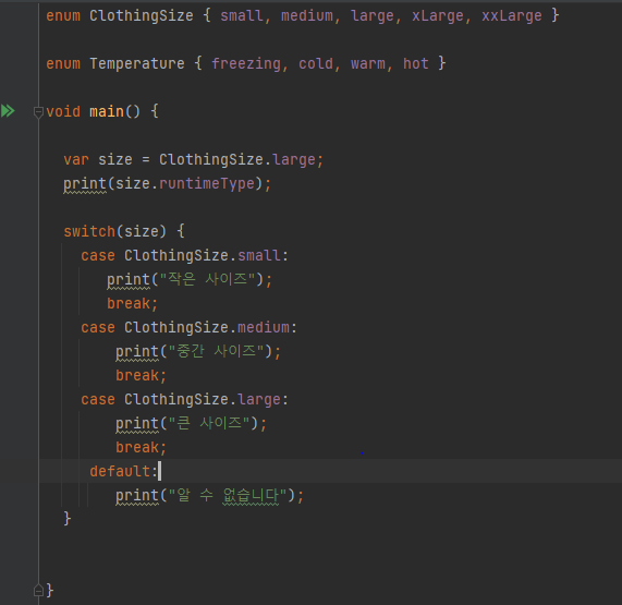 Dart에서 enum은 열거형(enumerated type)을 정의하는 데 사용되는 타입입니다. 열거형은 몇 개의 명명된 값을 가지는 타입을 생성할 수 있는 강력한 도구입니다.