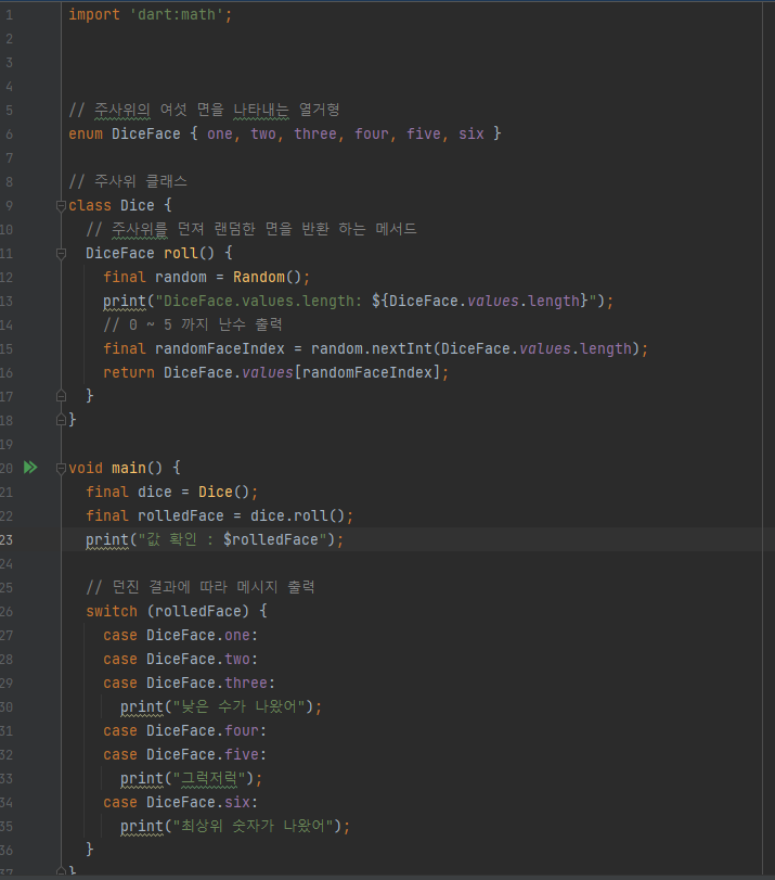 // 2. dart:math; 랜덤 변수 하나를 뽑아 주세요 Random random = new Random();, import 'dart:math';