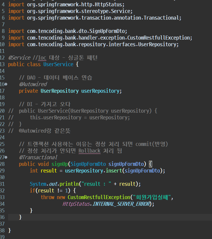 코드 결합도를 낮추고 재 사용성을 높이기 위함 ( 트랜잭션 처리 ) - 서비스를 사용하는 이유