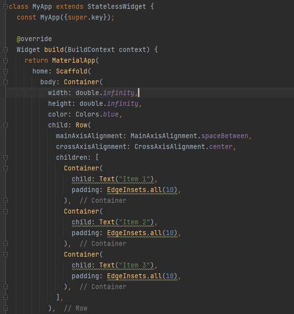 | MainAxisAlignment.start 자식 위젯들을 Row의 시작 부분에 정렬합니다. MainAxisAlignment.end 자식 위젯들을 Row의 끝 부분에 정렬합니다. MainAxisAlignment.center 자식 위젯들을 가운데에 정렬합니다. MainAxisAlignment.spaceBetween 시작과 끝의 위젯을 Row의 양끝에 정렬하고 나머지 위젯들은 사이에 균등한 공간을 가지게 정렬합니다. MainAxisAlignment.spaceAround 자식 위젯들 주위에 균등한 공간을 만들어 정렬합니다. MainAxisAlignment.spaceEvenly 자식 위젯들 사이, 그리고 양 끝에 균등한 공간을 만들어 정렬합니다. |