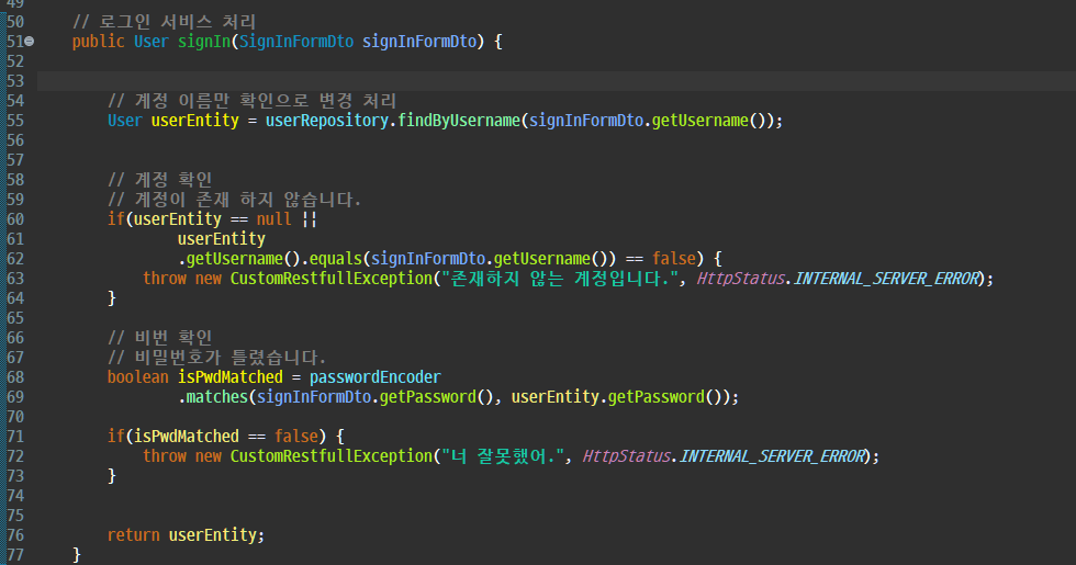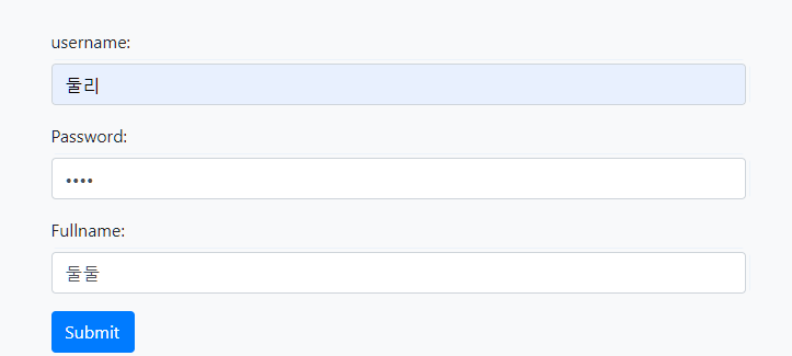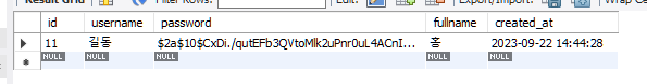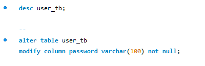 | 스키마 변경 해야 함 alter table user_tb modify column password varchar(100) not null; ![]() |