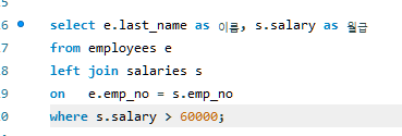 # salary가 60000원 보다 많은 직원들의 이름을 구하자