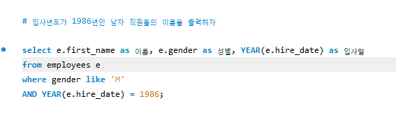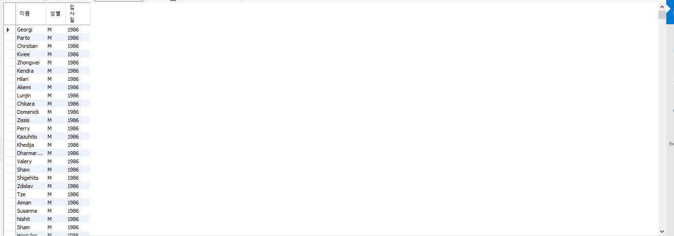 입사년도가 1986년인 남자 직원들의 이름을 출력하자