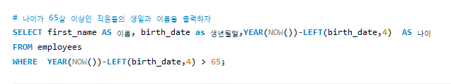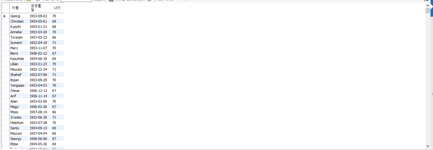 나이가 65세 이상인 직원들의 생일과 이름을 출력하자