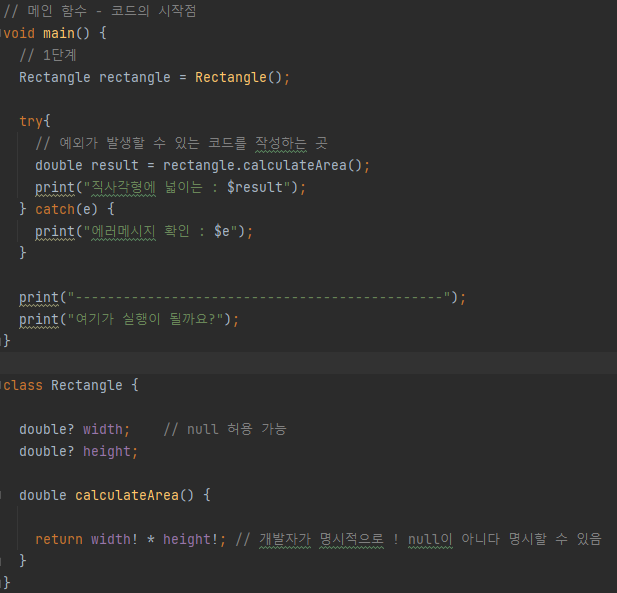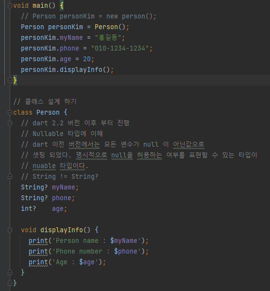 2.12 버전 이후부터 Nullable 타입 도입. 이전 버전의 dart 에서는 모든 변수가 null이 아닌 값으로 초기화 되었기 때문에 변수가 null을 허용 하는지 여부를 명시적으로 표현할 수 있는 Nullable 타입이 추가 되었다.