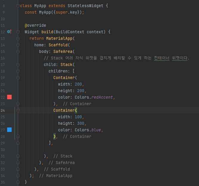 Stack 위젯은 주로 위젯들 간의 위치를 상대적으로 정의할 때 사용됩니다.