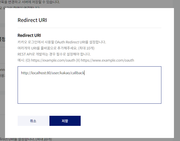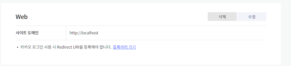- Redirect URI 등록하기(http://localhost:80/user/kakao/callback)