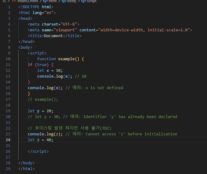 블록 스코프 - let으로 선언한 변수는 블록 내에서만 유효합니다.