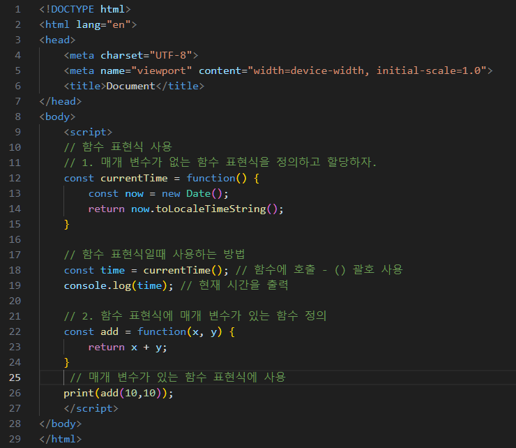| 화살표 함수(arrow function) ES6 이후 버전에서 => 표기법을 사용해서 함수 선언을 간단하게 작성 일반 함수 표현식보다 간결하고 짧은 문법을 제공하며 주로 익명 함수로 사용됩니다. 화살표 함수는 주로 함수 내부에서 this 컨텍스트가 고정되는 특성을 가지고 있습니다. 주의) 2번째 예제에서 알아 봅시다. 함수 내부에서 this 컨텍스트가 고정되는 특성이란 - 화살표 함수와 일반 함수 표현식 간의 주요 차이 중 하나입니다. - 화살표 함수는 함수를 정의할 때, 함수가 선언된 위치에서의 this 컨텍스트를 상속받습니다. 이것은 함수 내부에서 this 키워드를 사용할 때, 해당 함수가 아닌 외부 함수나 객체의 this 값을 사용한다는 것을 의미합니다. |