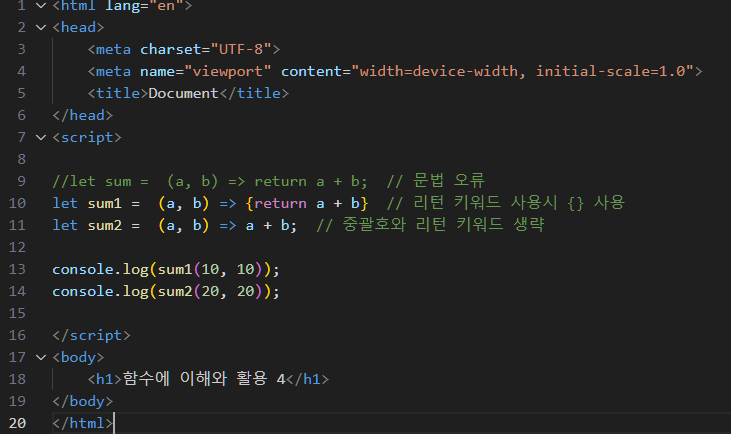 // return 키워드를 사용할 려면 반드시 중괄호를 붙어 사용하자.