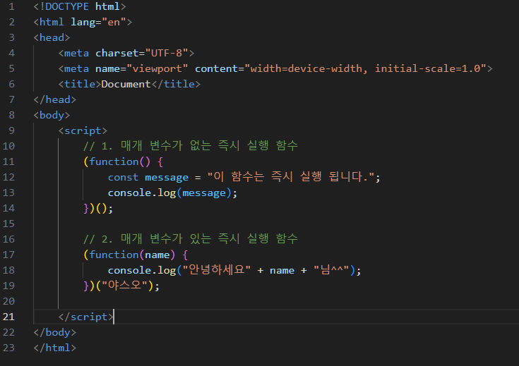 자바스크립트에서 즉시 실행 함수(IIFE, Immediately Invoked Function Expression)를 만들려면 함수를 정의하고 즉시 실행 연산자 ()로 둘러싸면 됩니다.