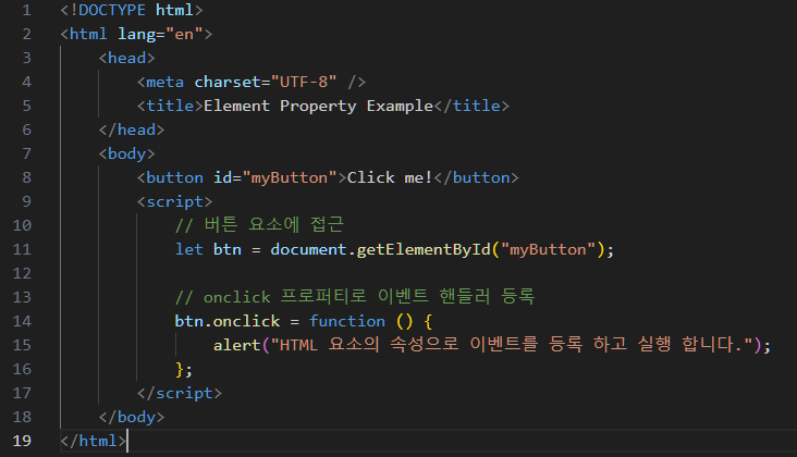 자바스크립트에서 HTML 요소의 프로퍼티로 이벤트를 등록하는 방식입니다.