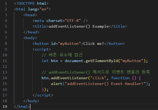 addEventListener() 메서드를 사용하여 이벤트 핸들러를 등록하는 방식입니다. 이 방식은 여러 이벤트 리스너를 동일한 요소에 추가할 수 있습니다.